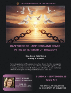 Please join UUCP for today’s in-person and online service, “Can There Be Happiness and Peace in the Aftermath of Tragedy?” led by Rev. Sonia Ketchian and Special Guest Speaker, Audrey B. Carlson, at 10:30 a.m.