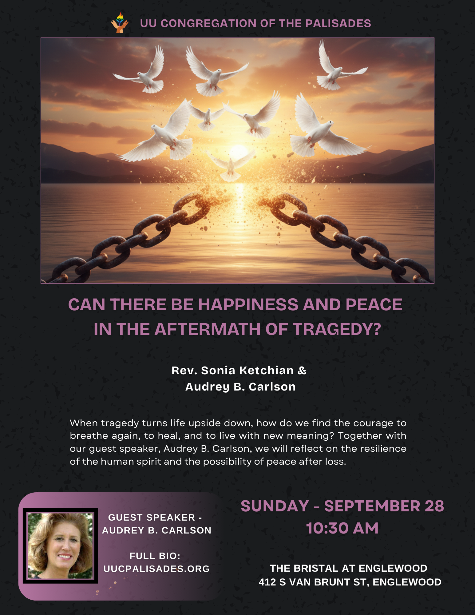 When tragedy turns life upside down, how do we find the courage to breathe again, to heal, and to live with new meaning? Together with our guest speaker, Audrey B. Carlson, we will reflect on the resilience of the human spirit and the possibility of peace after loss.