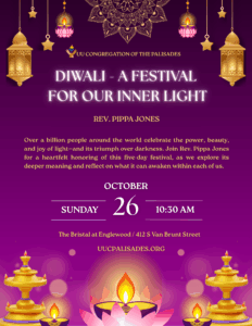 Please join UUCP for today’s in-person and online service, “Diwali – A Festival for Our Inner Light” led by Rev. Pippa Jones at 10:30 a.m.