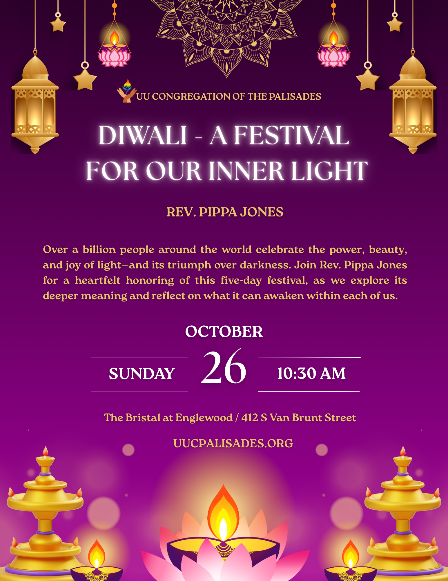 Over a billion people around the world celebrate the power, beauty, and joy of light—and its triumph over darkness. This Sunday, join Rev. Pippa Jones for a heartfelt honoring of this five-day festival, as we explore its deeper meaning and reflect on what it can awaken within each of us.