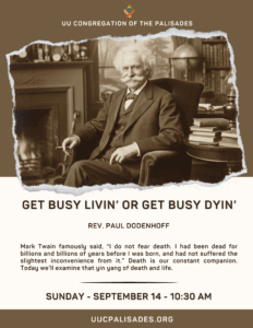 Please join UUCP for today’s online service, “Get Busy Livin’ or Get Busy Dyin’” led by Former UUCP Minister, Rev. Paul Dodenhoff, at 10:30 a.m.