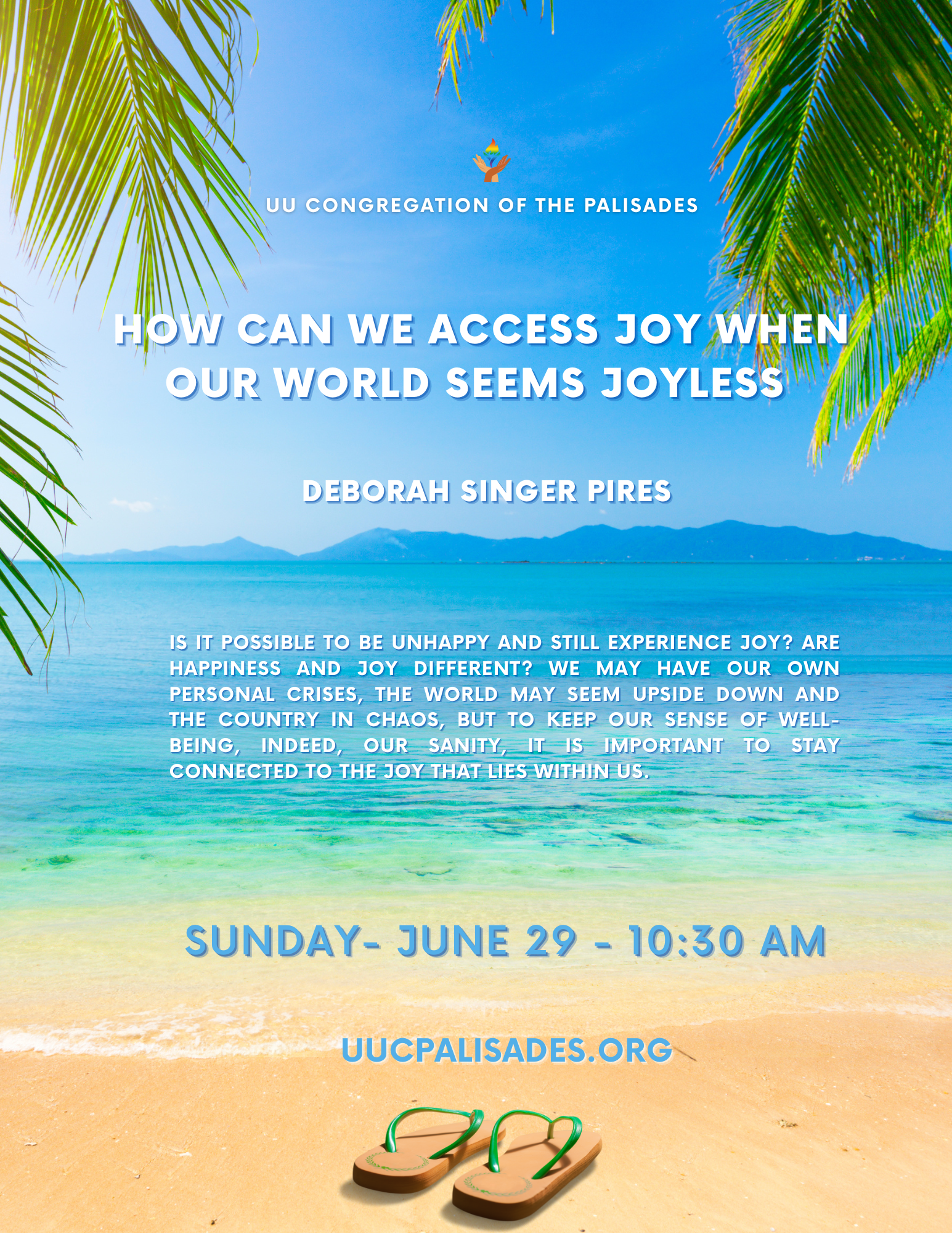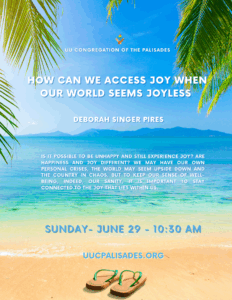 Please join UUCP for today’s online service, “How Can We Access Joy When Our World Seems Joyless?” led by Deborah Singer Pires, at 10:30 a.m.