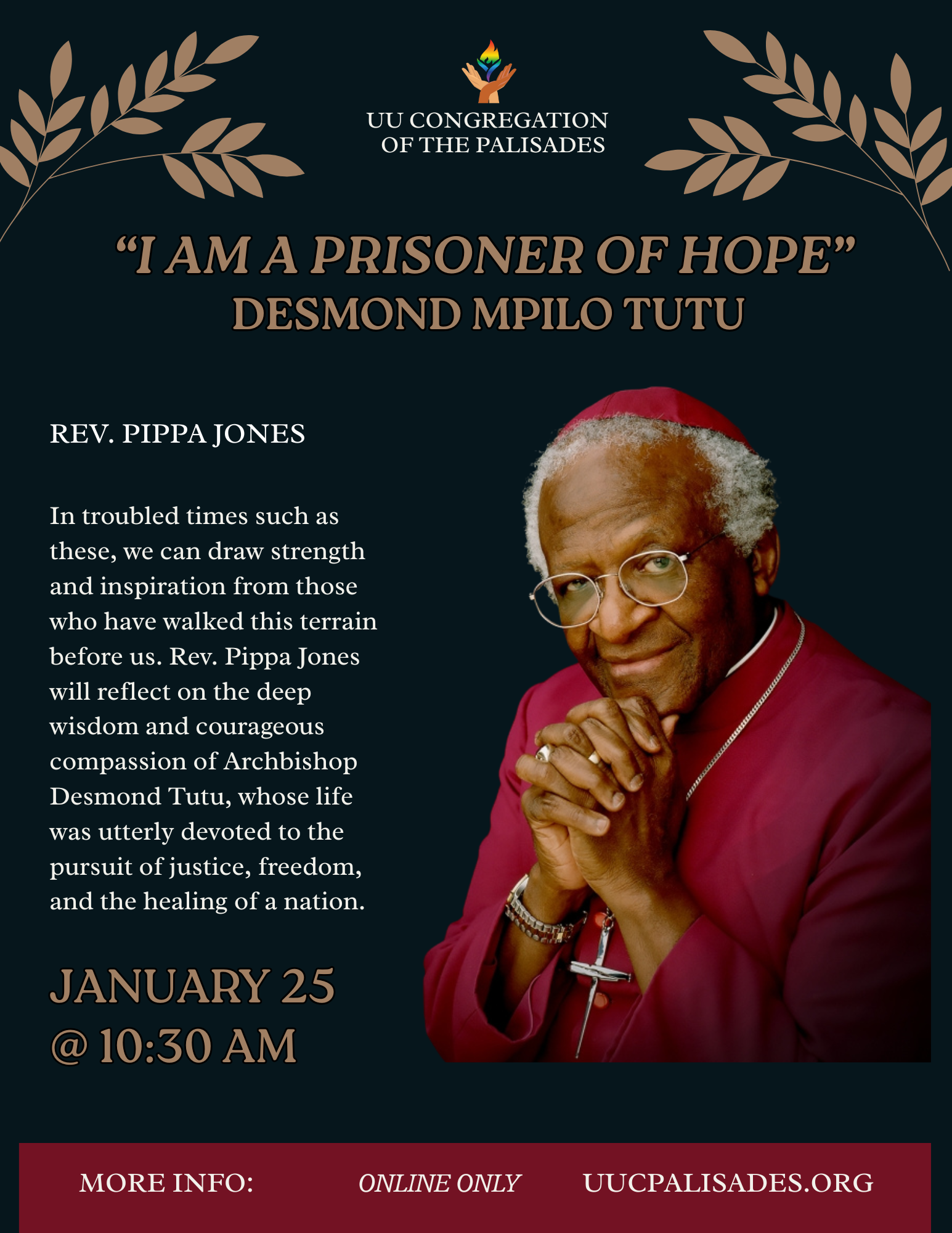 Log on at 10:30 a.m. for an inspiring service, “I am a prisoner of hope” (Desmond Mpilo Tutu), led by Rev. Pippa Jones. We are streaming live online and can’t wait to see you in the chat. You are welcome here!