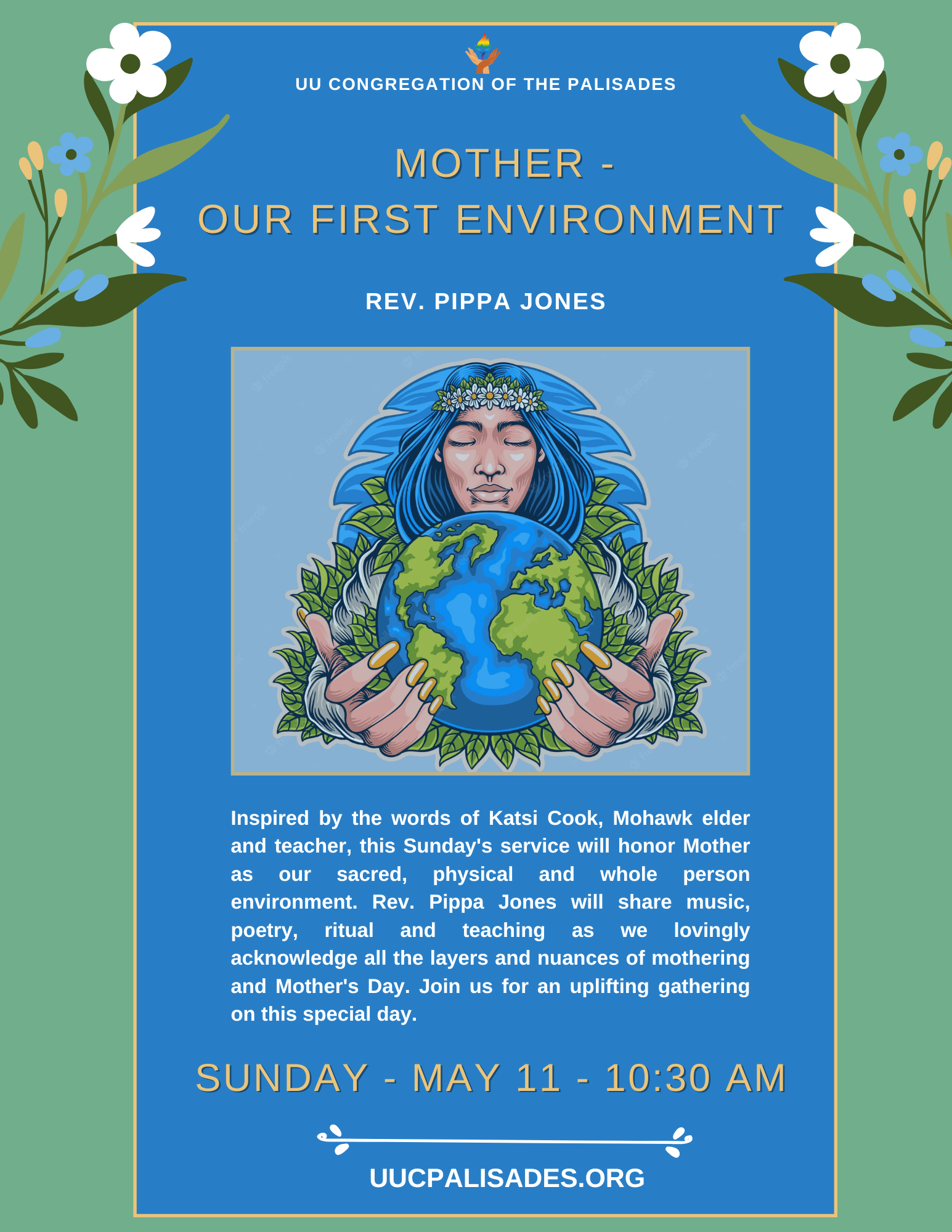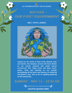 Inspired by the words of Katsi Cook, Mohawk elder and teacher, this Sunday’s service will honor Mother as our sacred, physical and whole person environment. Rev. Pippa Jones will share music, poetry, ritual and teaching as we lovingly acknowledge all the layers and nuances of mothering and Mother’s Day. Join us for an uplifting gathering on this special day.
