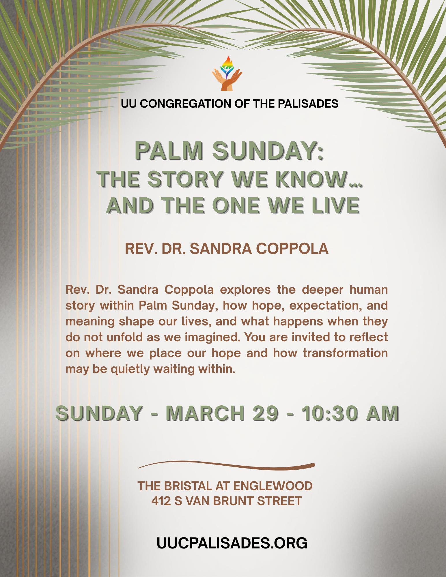 Sunday is here, and we’d love to see you! Join us at 10:30 a.m. for an inspiring service, “Palm Sunday: The Story We Know… and the One We Live” led by Rev. Dr. Sandra Coppola. We’re gathering both in person at The Bristal at Englewood and streaming live online. However you choose to join us, you are welcome here!