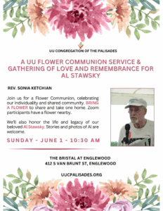 Please join UUCP for today’s in-person and online service, “A UU Flower Communion Service & Gathering of Love and Remembrance for Al Stawsky” led by Rev. Sonia Ketchian, at 10:30 a.m.