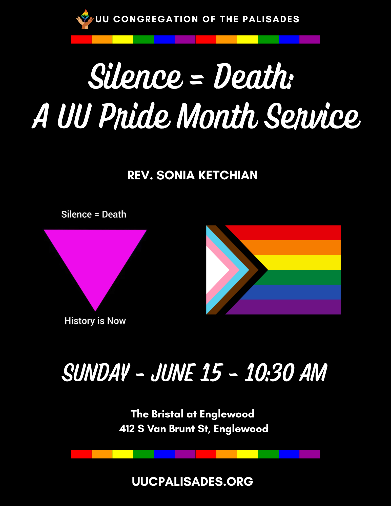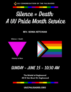 Please join UUCP for today’s in-person and online service, “Silence = Death: A UU Pride Month Service” led by Rev. Sonia Ketchian, at 10:30 a.m.