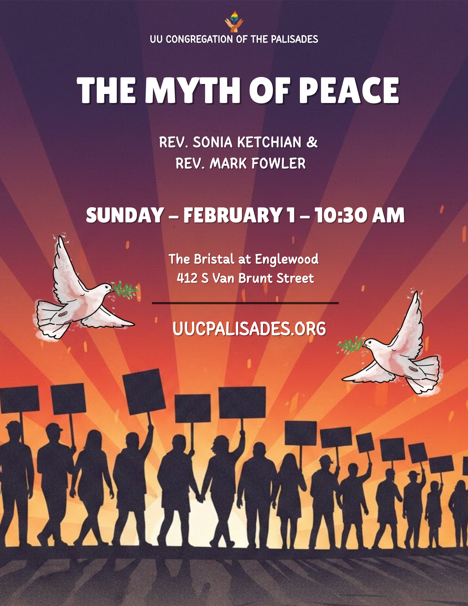 Join us at 10:30 a.m. for an inspiring service, “The Myth of Peace” led by Rev. Sonia Ketchian and Guest Minister, Rev. Mark Fowler. We’re gathering both in person at The Bristal at Englewood and streaming live online. However you choose to join us, you are welcome here!