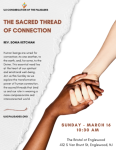 Please join UUCP for today’s in-person and online service, “The Sacred Thread of Connection” led by Rev. Sonia Ketchian at 10:30 a.m.