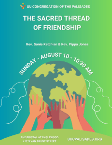 Please join UUCP for today’s in-person and online service, “The Sacred Thread of Friendship” led by Rev. Sonia Ketchian & Rev. Pippa Jones, at 10:30 a.m.