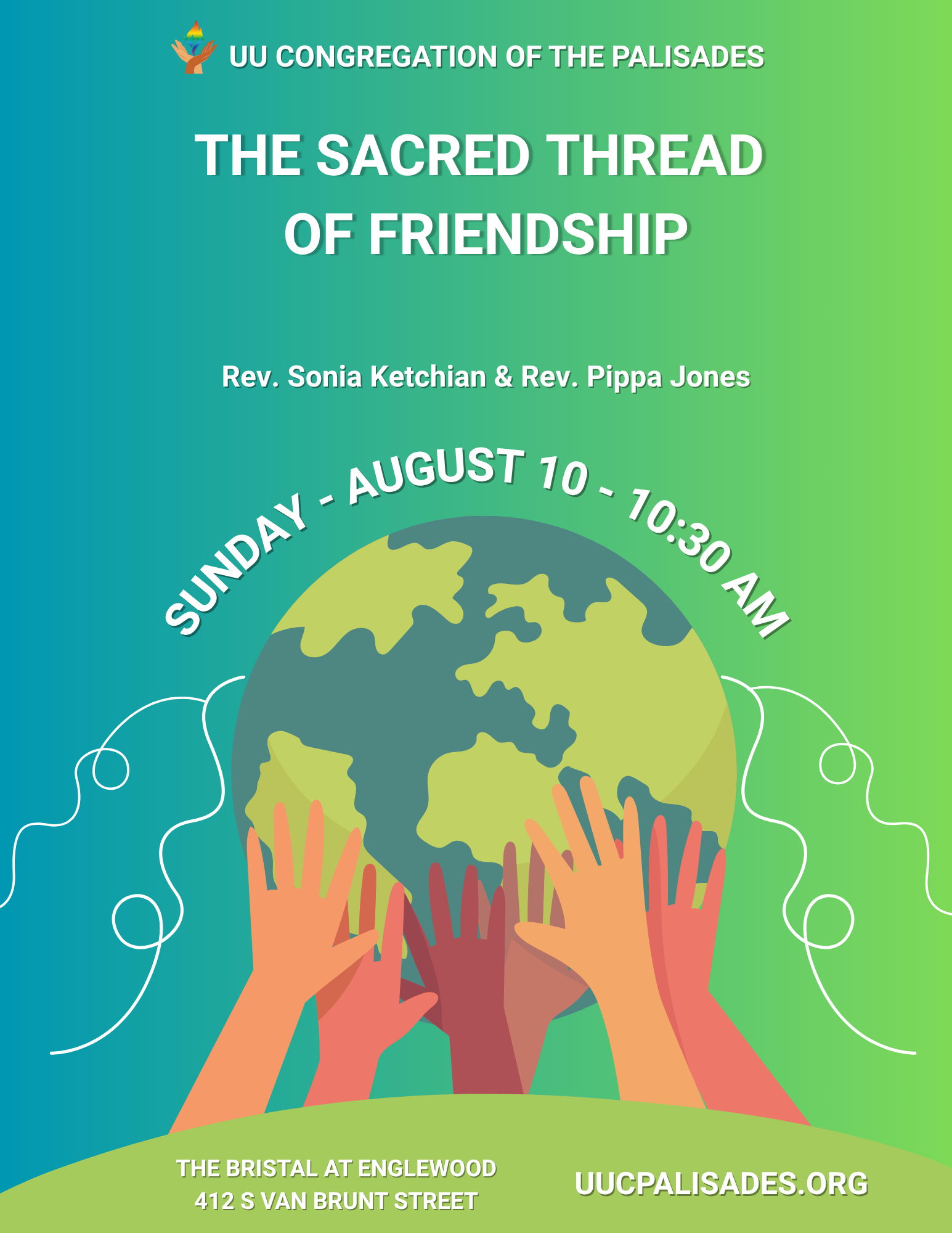 Join Rev. Sonia Ketchian and Rev. Pippa Jones this Sunday for The Sacred Thread of Friendship—a special UUCP service celebrating the sacred bonds that connect us across time and culture, and the joy of Rev. Pippa’s IN-PERSON visit from South Africa.