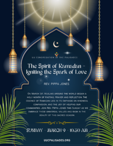Please join UUCP for today’s online service, “The Spirit of Ramadan – Igniting the Spark of Love” with Rev. Pippa Jones at 10:30 a.m.