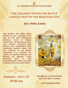 Please join UUCP for today’s in-person and online service, “The Stillness Within the Battle” – A Reflection on the Bhagavad Gita” led by Rev. Pippa Jones, at 10:30 a.m.