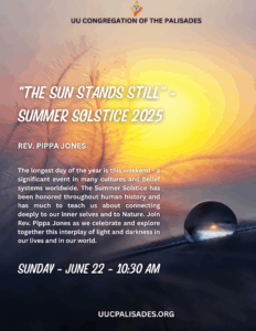 Please join UUCP for today’s online service, “The Sun Stands Still” – Summer Solstice 2025, led by Rev. Pippa Jones, at 10:30 a.m.