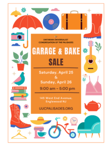 Our annual Spring Garage & Bake Sale is almost here! Join us and help raise funds for The Unitarian Universalist Congregation of the Palisades (UUCP).