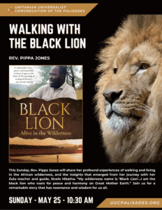 This Sunday, Rev. Pippa Jones will share her profound experiences of walking and living in the African wilderness, and the insights that emerged from her journey with her Zulu teacher and guide, Sicelo Mbatha. “My wilderness name is ‘Black Lion’…I am the black lion who roars for peace and harmony on Great Mother Earth.” Join us for a remarkable story that has resonance and wisdom for us all.