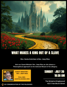 Please join UUCP for today’s in-person and online service, “What Makes a King Out of a Slave” led by Rev. Sonia Ketchian and Special Guest Speaker, Rev. Jeep Ries, at 10:30 a.m.